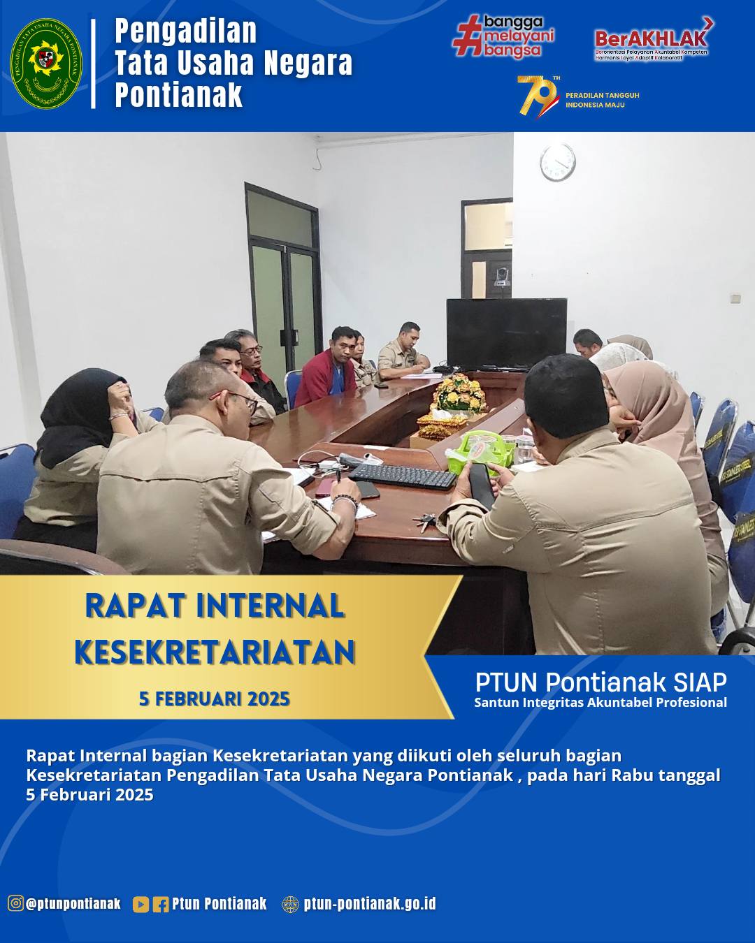 Rabu, 5 Februari 2025 Kesekretariatan PTUN Pontianak melaksanakan rapat internal yang diikuti oleh seluruh bagian Kesekretariatan Pengadilan Tata Usaha Negara Pontianak baik kasubbag maupun anggotanya serta seluruh PPNPN