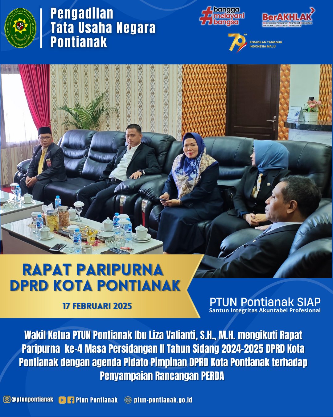 Senin, 17 Februari 2025, Wakil Ketua PTUN Pontianak Ibu Liza Valianti, S.H., M.H. mengikuti Rapat Paripurna ke-4 Masa Persidangan II Tahun Sidang 2024-2025 DPRD Kota Pontianak dengan agenda Pidato Pimpinan DPRD Kota Pontianak terhadap Penyampaian Rancangan PERDA