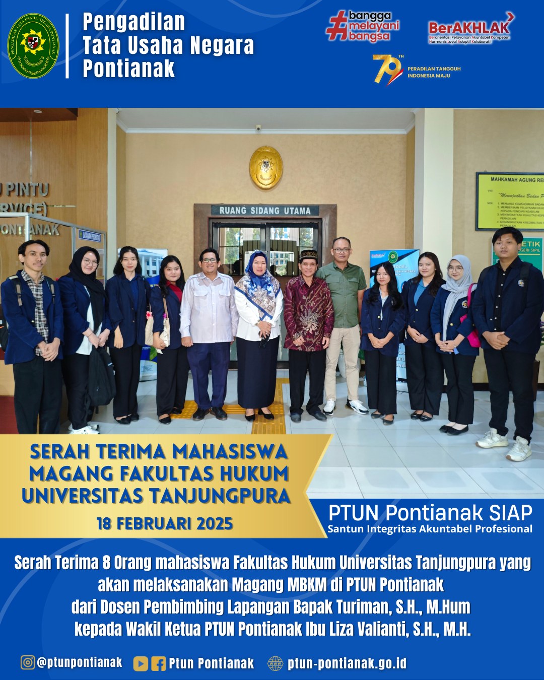 Selasa, 18 Februari 2025, Serah Terima 8 Orang mahasiswa Fakultas Hukum Universitas Tanjungpura yang akan melaksanakan Magang MBKM di PTUN Pontianak dari Dosen Pembimbing Lapangan Bapak Turiman, S.H., M.Hum kepada Wakil Ketua PTUN Pontianak Ibu Liza Valianti, S.H., M.H.