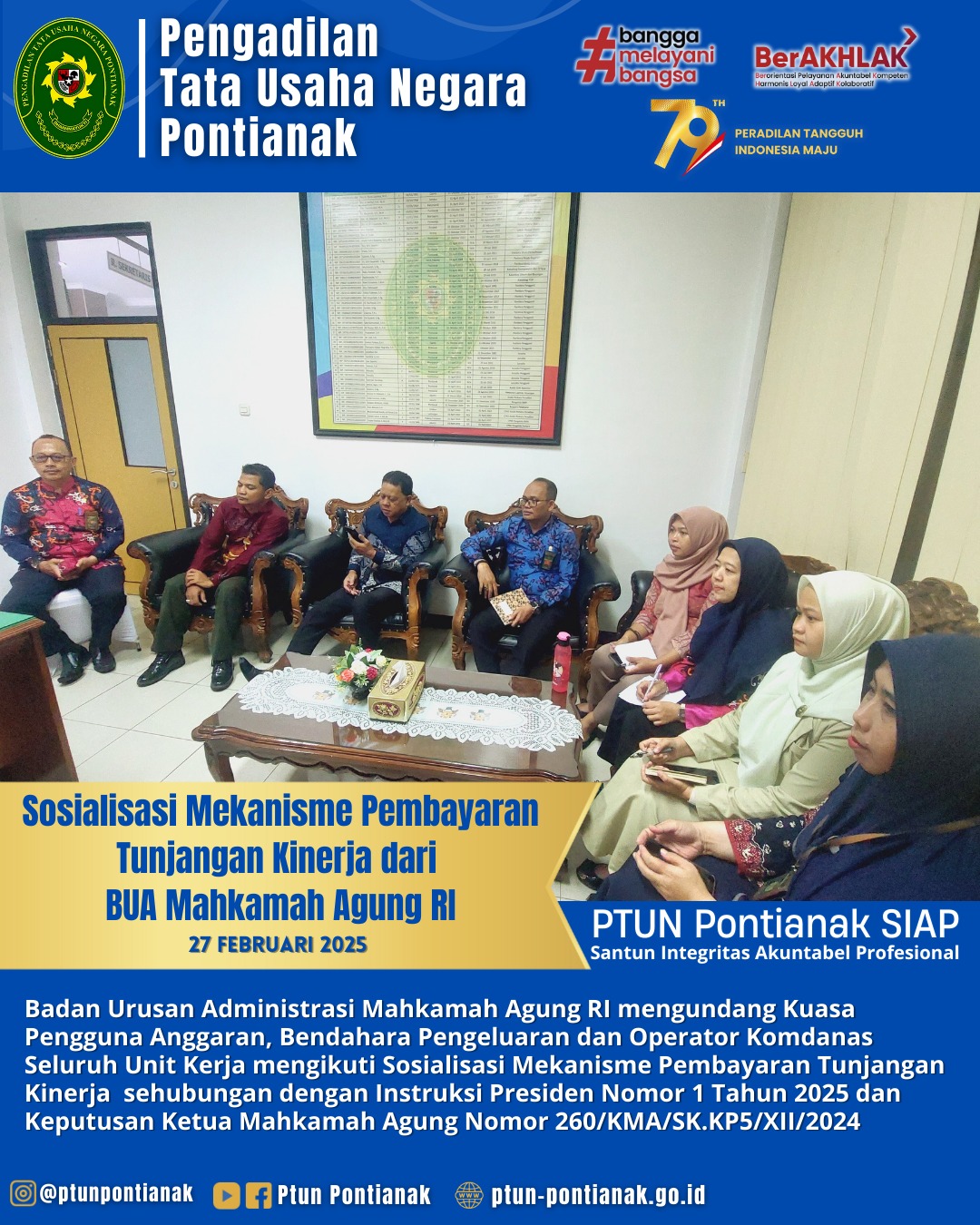 Kamis, 27 Februari 2025, Badan Urusan Administrasi Mahkamah Agung RI mengundang Kuasa Pengguna Anggaran, Bendahara Pengeluaran dan Operator Komdanas Seluruh Unit Kerja mengikuti Sosialisasi Mekanisme Pembayaran Tunjangan Kinerja sehubungan dengan Instruksi Presiden Nomor 1 Tahun 2025 dan Keputusan Ketua Mahkamah Agung Nomor 260/KMA/SK.KP5/XII/2024.