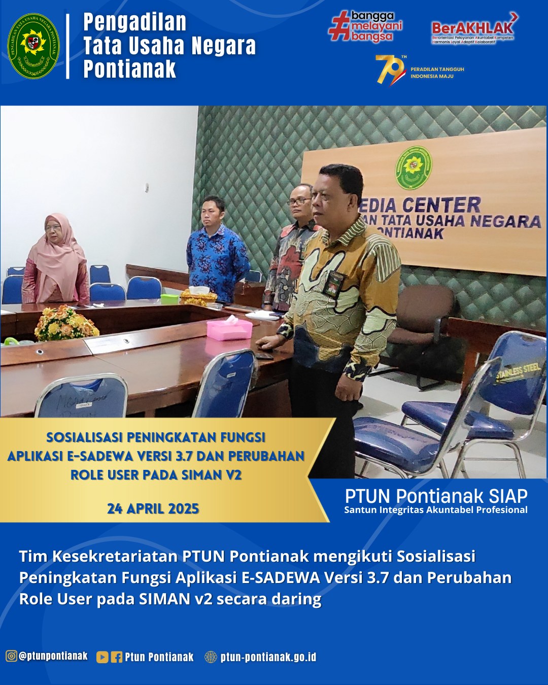 Kamis, 24 April 2025 Tim Kesekretariatan PTUN Pontianak mengikuti Sosialisasi Peningkatan Fungsi Aplikasi E-SADEWA Versi 3.7 dan Perubahan Role User pada SIMAN v2 secara daring