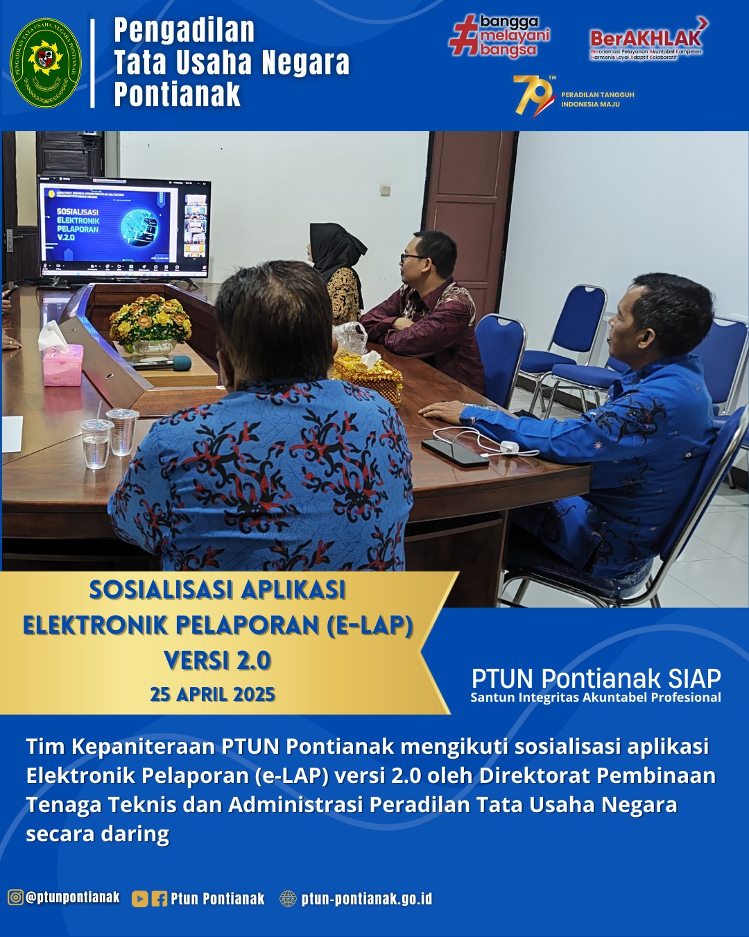 Tim Kepaniteraan PTUN Pontianak mengikuti sosialisasi aplikasi Elektronik Pelaporan (e-LAP) versi 2.0 oleh Direktorat Pembinaan Tenaga Teknis dan Administrasi Peradilan Tata Usaha Negara secara daring pada Jumat, 25 April 2025