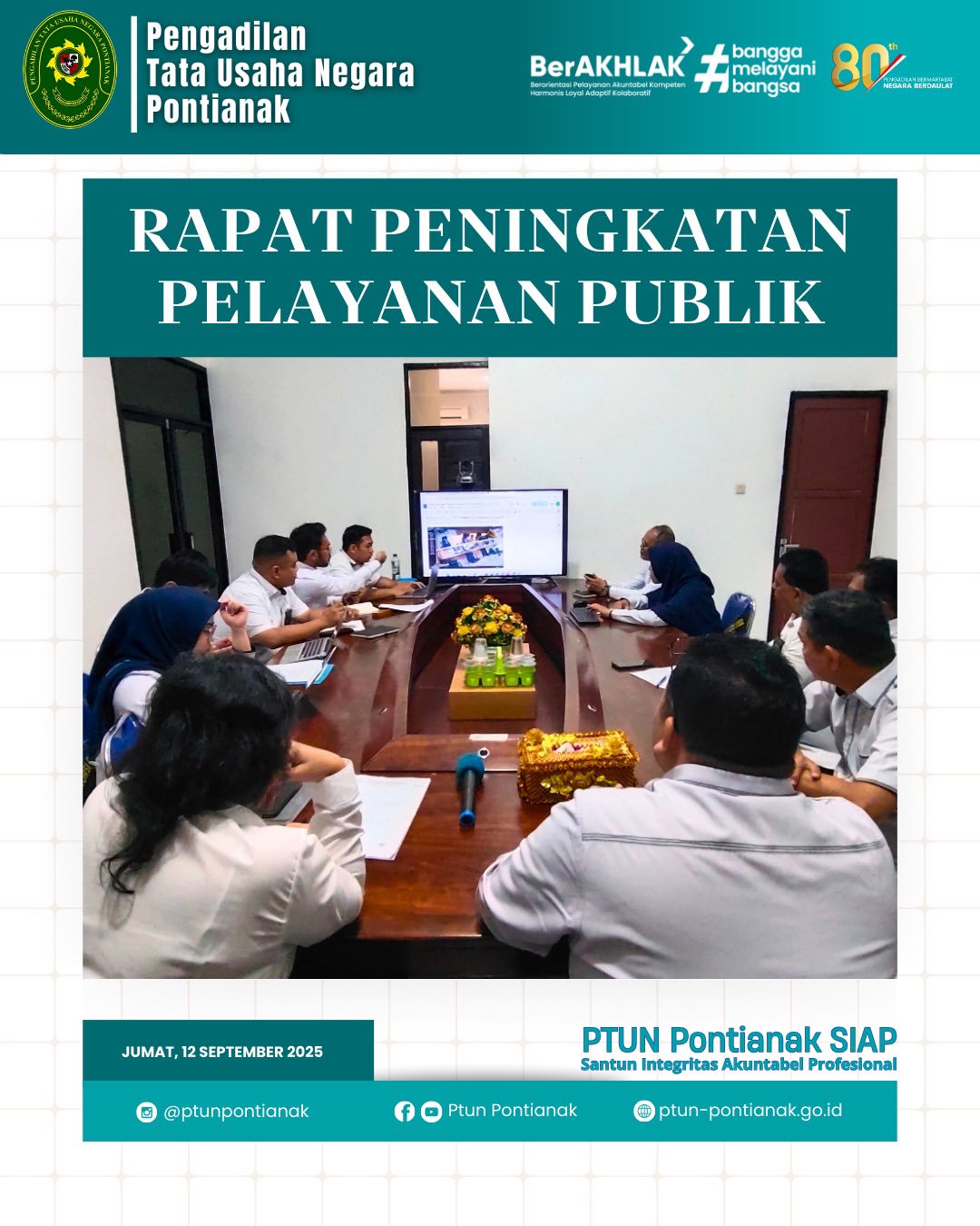 Senin, 15 September 2025, Ketua, Wakil Ketua, Para Hakim, Panitera, Sekretaris, Para Panitera Muda, serta Para Kasubbag PTUN Pontianak melaksanakan rapat peningkatan pelayanan publik di Media Center PTUN Pontianak. Rapat ini merupakan tindak lanjut dari Kegiatan Peningkatan Pelayanan Peradilan di Lingkungan Peradilan Tata Usaha Negara yang sebelumnya telah dilaksanakan. Kegiatan ini menjadi salah satu upaya berkelanjutan dalam meningkatkan kualitas pelayanan publik, memperkuat koordinasi, serta memastikan penerapan pelayanan yang prima, profesional, dan sesuai standar di seluruh satuan kerja peradilan.