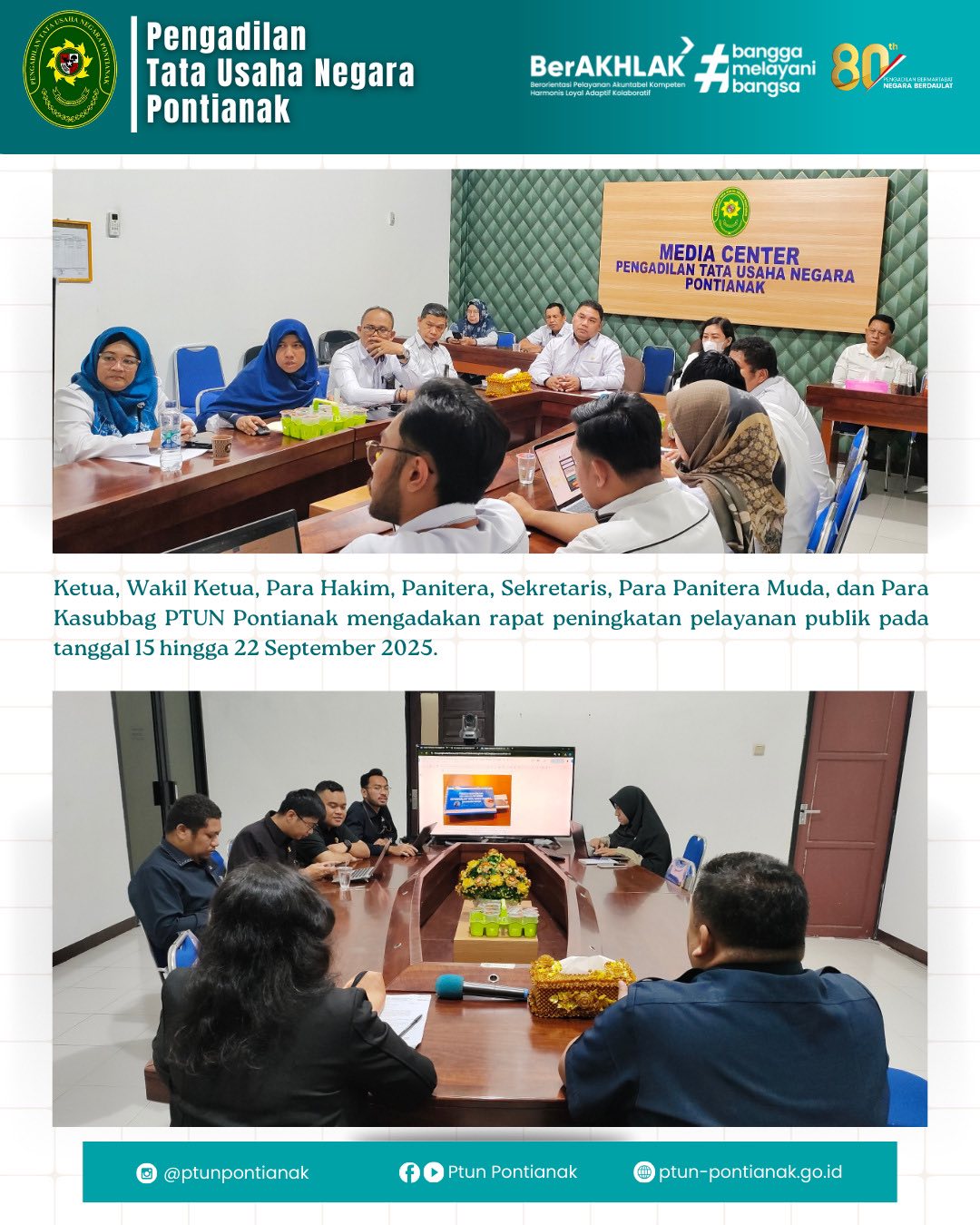 Ketua, Wakil Ketua, Para Hakim, Panitera, Sekretaris, Para Panitera Muda, serta Para Kasubbag PTUN Pontianak melaksanakan rapat peningkatan pelayanan publik di Media Center PTUN Pontianak pada tanggal 15 hingga 22 September 2025.