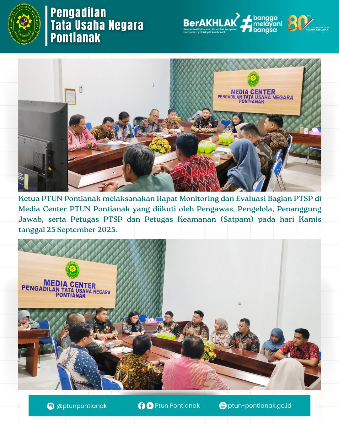 Kamis, 25 September 2025, Ketua PTUN Pontianak melaksanakan Rapat Monitoring dan Evaluasi Bagian PTSP di Media Center PTUN Pontianak yang diikuti oleh Pengawas, Pengelola, Penanggung Jawab, serta Petugas PTSP dan Petugas Keamanan (Satpam). Dalam rapat tersebut, dilakukan pembahasan mengenai pelaksanaan pelayanan, evaluasi terhadap kendala yang dihadapi, serta langkah-langkah perbaikan untuk meningkatkan kualitas layanan PTSP di lingkungan PTUN Pontianak.