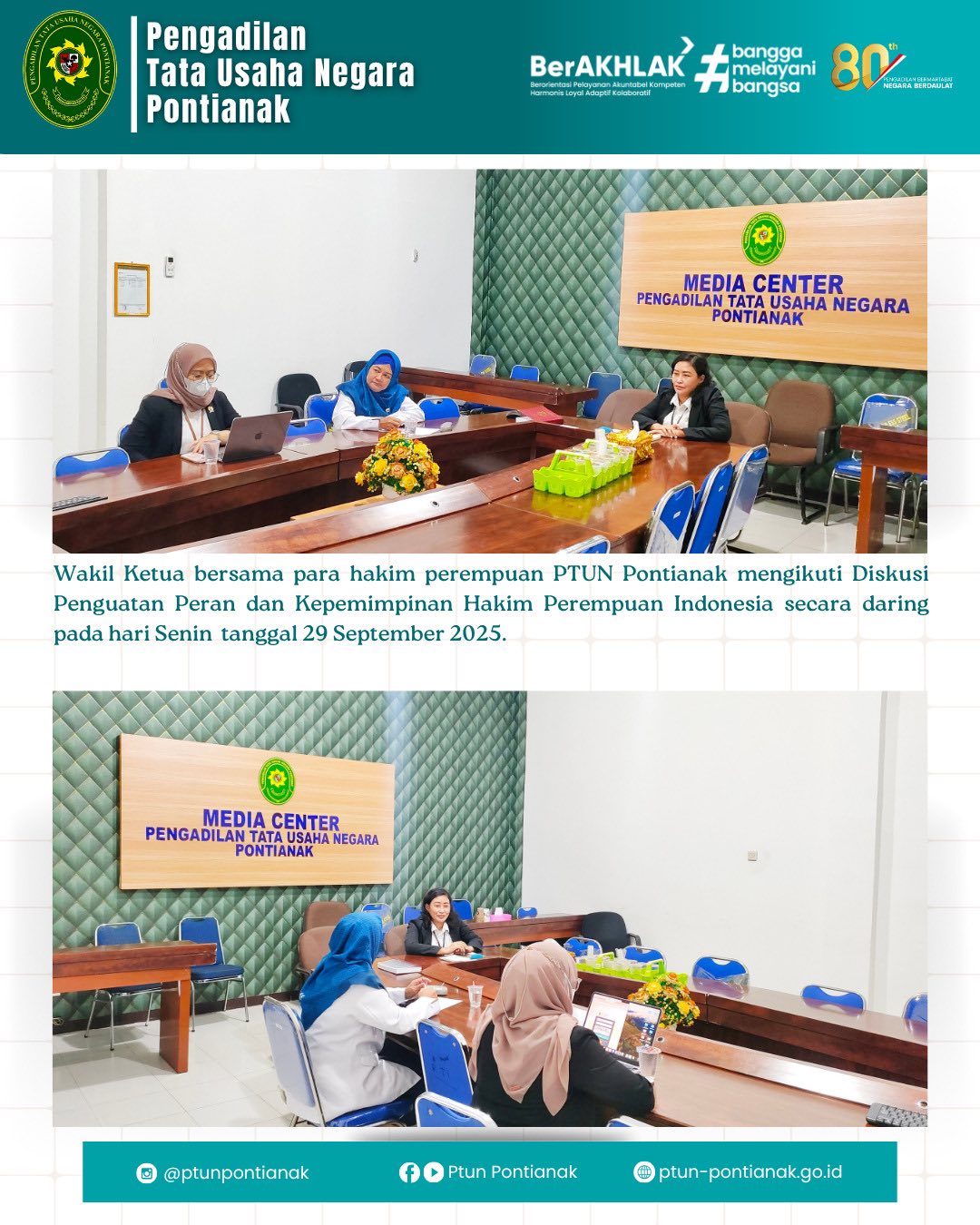 Senin, 29 September 2025 Wakil Ketua bersama para hakim perempuan PTUN Pontianak berpartisipasi dalam Diskusi Penguatan Peran dan Kepemimpinan Hakim Perempuan Indonesia yang diselenggarakan oleh Badan Perhimpunan Hakim Perempuan Indonesia (BPHPI) secara daring melalui zoom meeting.