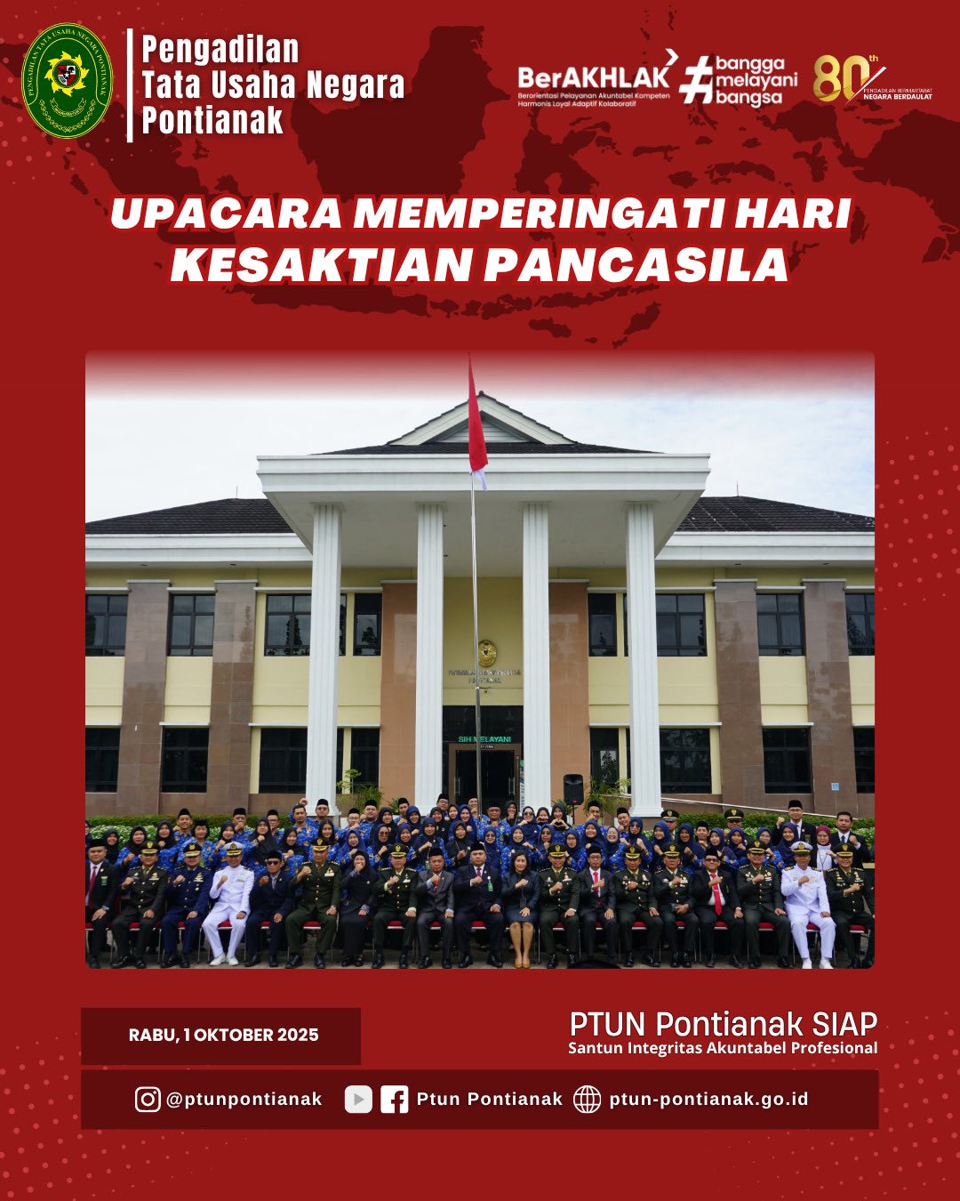 Rabu, 1 Oktober 2025, Pengadilan Tata Usaha Negara Pontianak bersama Pengadilan Agama Pontianak dan Pengadilan Militer I-05 Pontianak melaksanakan Upacara Memperingati Hari Kesaktian Pancasila yang berlangsung di halaman Pengadilan Agama Pontianak. Upacara ini digelar dengan penuh khidmat sebagai bentuk penghormatan atas perjuangan bangsa dalam mempertahankan ideologi Pancasila. Peringatan ini juga mengingatkan kita bahwa Pancasila tetap kokoh sebagai dasar negara sekaligus pemersatu bangsa hingga saat ini.
