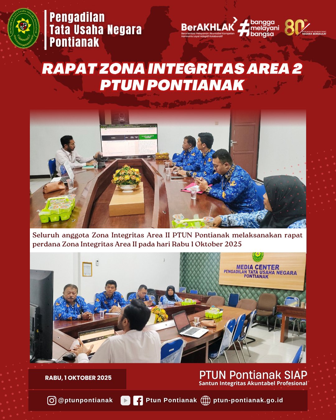 Rabu, 1 Oktober 2025, Koordinator bersama seluruh anggota Tim Zona Integritas Area 2 PTUN Pontianak melaksanakan rapat perdana Zona Integritas Area 2 tentang Penataan Tatalaksana. Rapat ini difokuskan pada pembahasan strategi dan langkah nyata untuk mendukung terwujudnya Wilayah Bebas dari Korupsi (WBK) serta Wilayah Birokrasi Bersih dan Melayani (WBBM) di PTUN Pontianak.