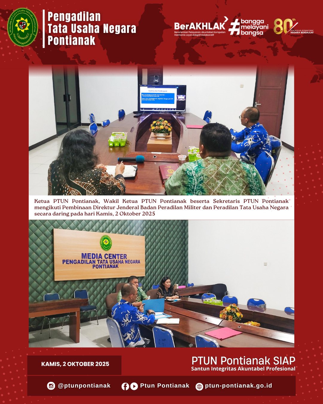 Kamis, 2 Oktober 2025, Ketua, Wakil Ketua dan Sekretaris PTUN Pontianak mengikuti kegiatan Pembinaan Direktur Jenderal Badan Peradilan Militer dan Peradilan Tata Usaha Negara secara daring melalui Zoom Meeting. Kegiatan ini dilaksanakan berdasarkan Surat Undangan Nomor 1127/DJMT/UND.KP3.4.3/IX/2025 tanggal 30 September 2025, dengan agenda pembinaan dan pembahasan kegiatan rapat koordinasi teknis di lingkungan Peradilan Militer dan Peradilan Tata Usaha Negara.