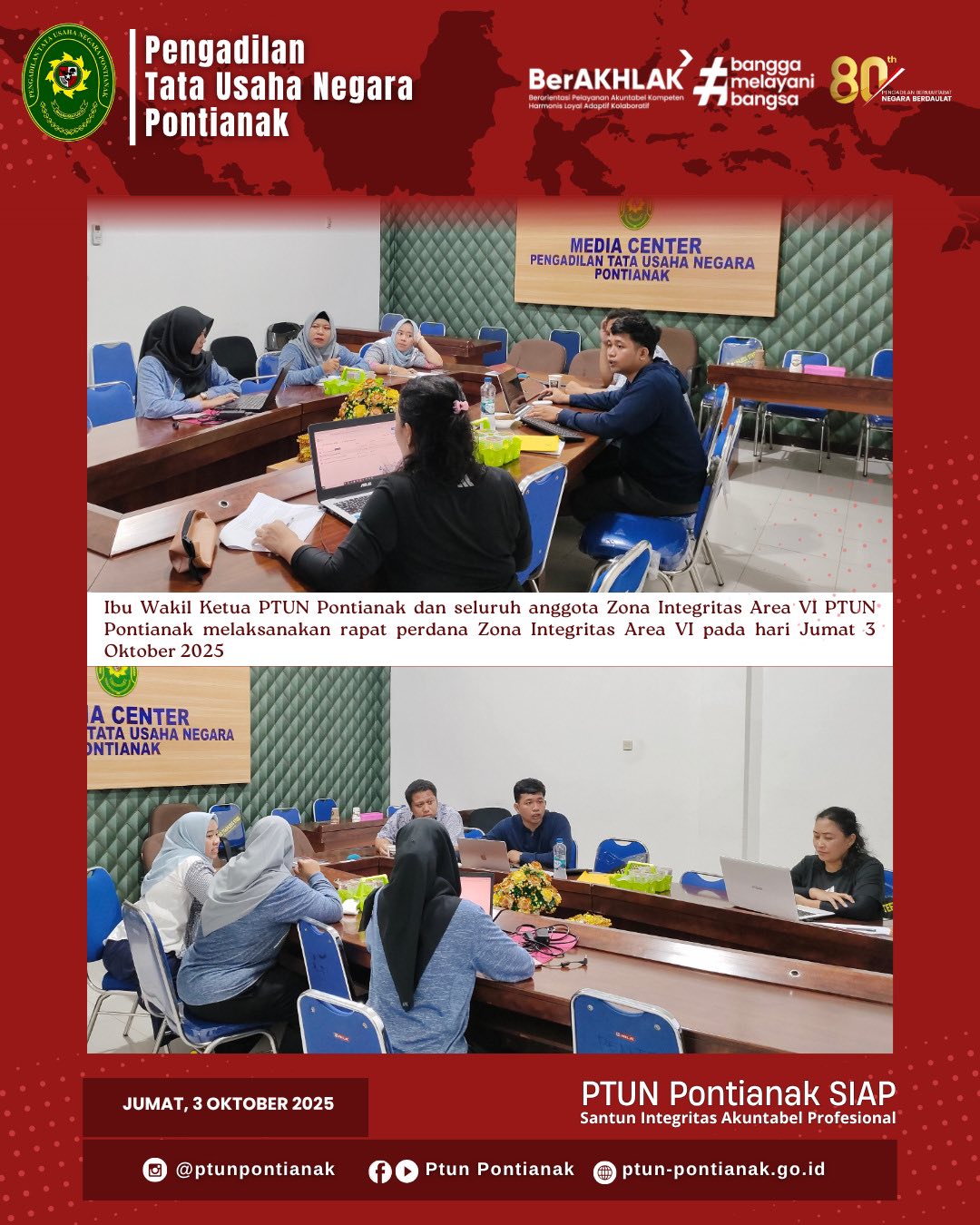 Jumat, 3 Oktober 2025, Wakil Ketua bersama seluruh anggota Tim Zona Integritas Area 6 PTUN Pontianak melaksanakan rapat perdana Zona Integritas Area 6 tentang Peningkatan Kualitas Pelayanan Publik. Rapat ini membahas langkah strategis dalam peningkatan akuntabilitas dan kinerja aparatur, guna mendukung terwujudnya Wilayah Bebas dari Korupsi (WBK) serta Wilayah Birokrasi Bersih dan Melayani (WBBM) di PTUN Pontianak.