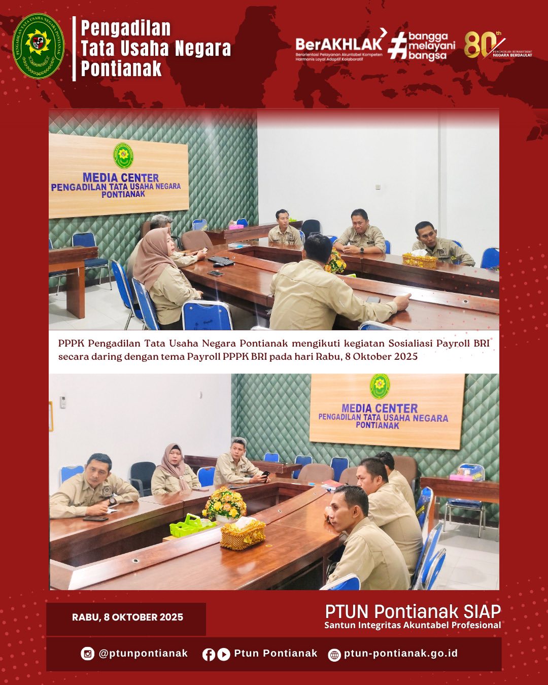 Rabu, 8 Oktober 2025, Pegawai Pemerintah dengan Perjanjian Kerja (PPPK) pada Pengadilan Tata Usaha Negara Pontianak mengikuti kegiatan Sosialisasi Payroll BRI secara daring melalui Zoom Meeting. Kegiatan ini diselenggarakan oleh BRI Pusat untuk memberikan pemahaman terkait mekanisme payroll bagi PPPK serta solusi atas kendala yang mungkin timbul dalam proses penggajian maupun pengajuan kredit BRI.