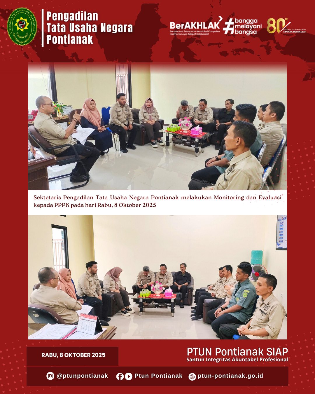 Rabu, 8 Oktober 2025, Sekretaris Pengadilan Tata Usaha Negara Pontianak melaksanakan kegiatan Monitoring dan Evaluasi terhadap Pegawai Pemerintah dengan Perjanjian Kerja (PPPK). Kegiatan ini bertujuan untuk meninjau pelaksanaan tugas dan tanggung jawab PPPK, sekaligus memberikan arahan dan evaluasi atas kinerja yang telah dilaksanakan. Melalui kegiatan ini, diharapkan para PPPK dapat terus meningkatkan disiplin, profesionalisme, dan integritas dalam mendukung pelayanan publik yang prima di lingkungan PTUN Pontianak.